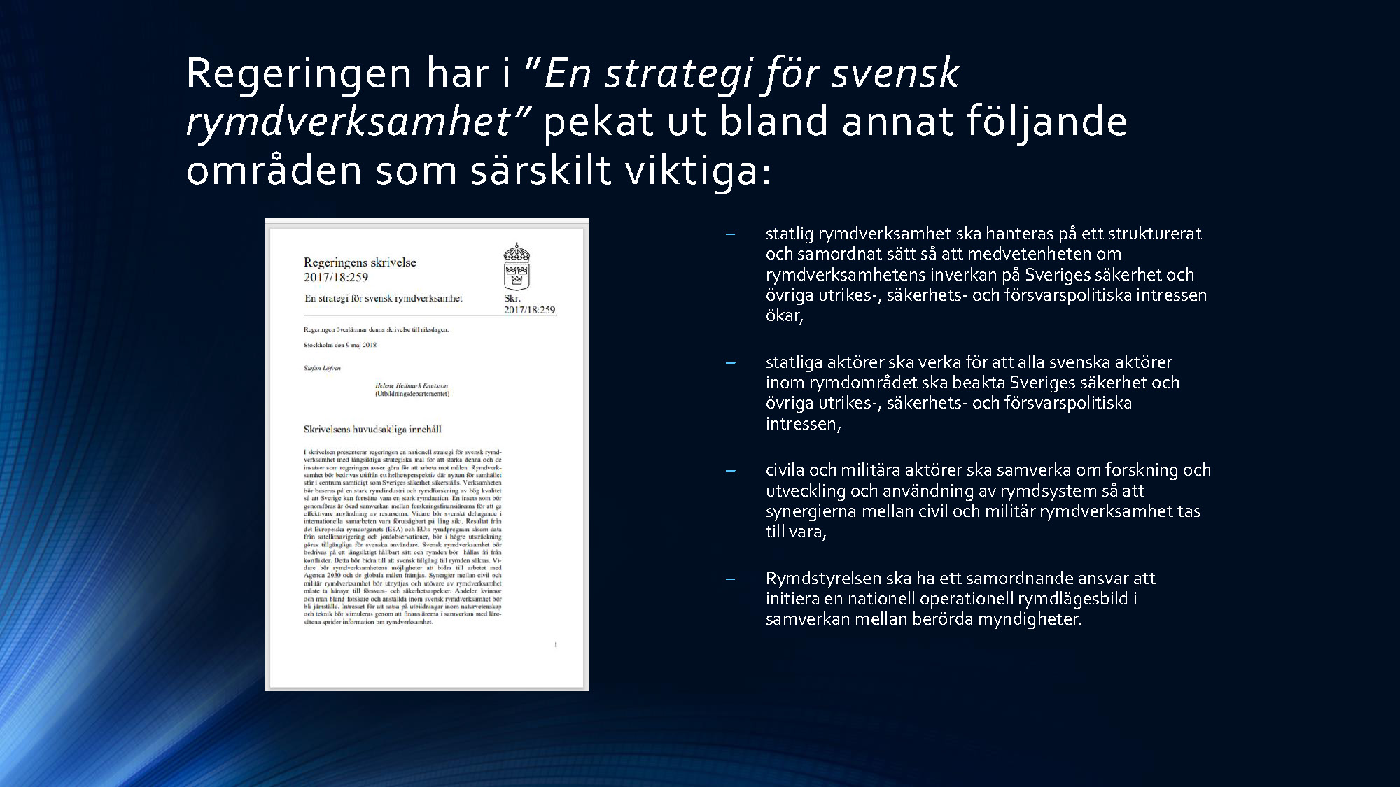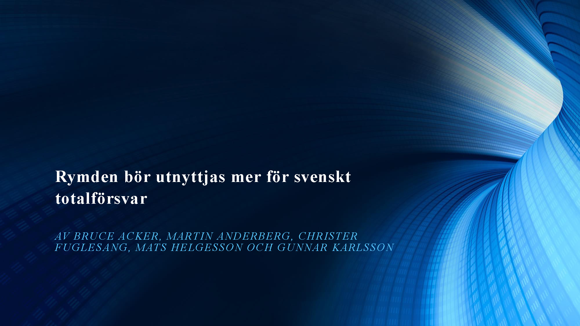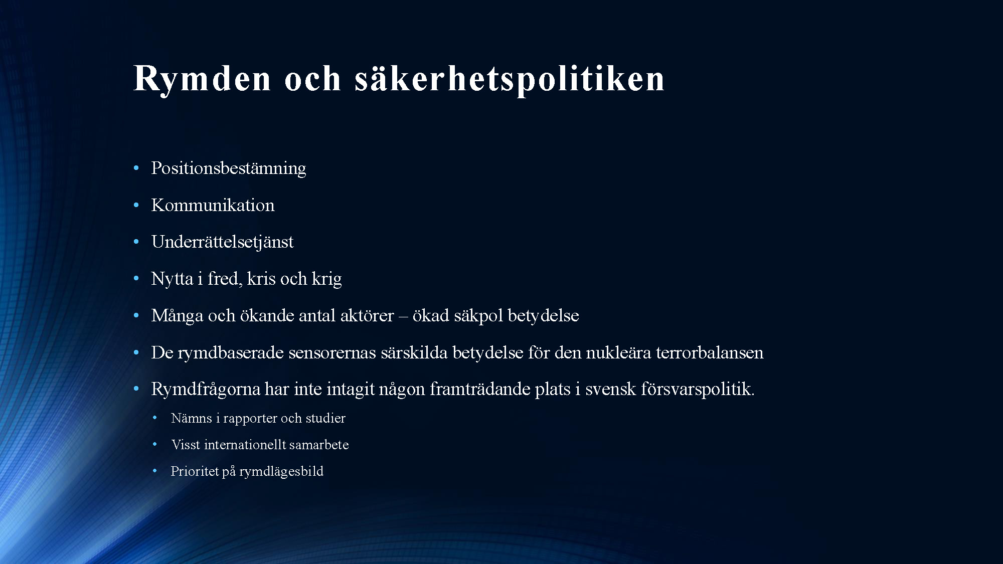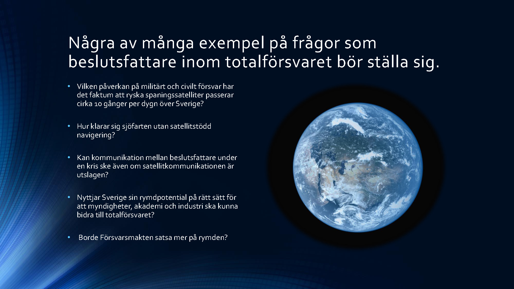 Andra programpunkten var en redovisning av ett arbete om rymden genomfört av en arbetsgrupp inom projektet Säkerhet i morgondagens Europa – Svenska perspektiv. Ledamoten Mats Helgesson som lett arbetet redovisade tillsammans med professor Christer Fuglesang (ledamot i franska flyg- och rymdakademien) som ingått i arbetsgruppen. I sina avslutande slutsatser förordade ledamoten Helgesson att Sverige ska utöka sitt arbete inom rymdområdet och att detta arbete berör alla avdelningar och därför med fördel skulle kunna bedrivas i en fast akademieövergripande arbetsgrupp. Arbete kommer att redovisas i Handlingar och Tidskrift. Bildspelet nedan sammanfattar ledamoten Helgessons anförande. Du kan också se bildspelet som pdf-fil här »