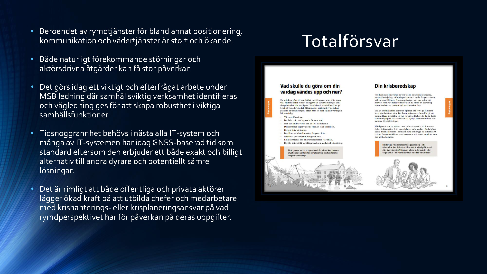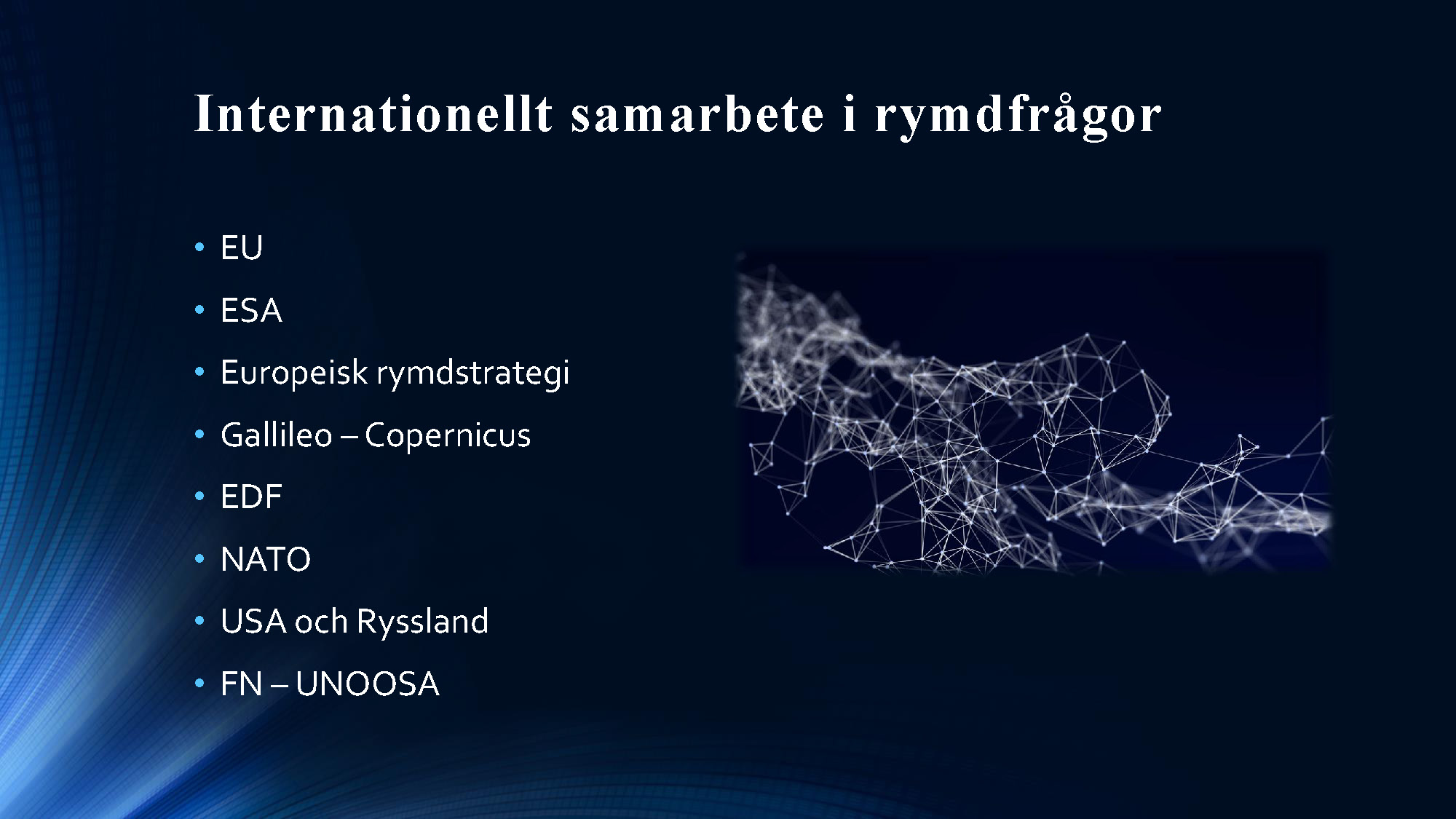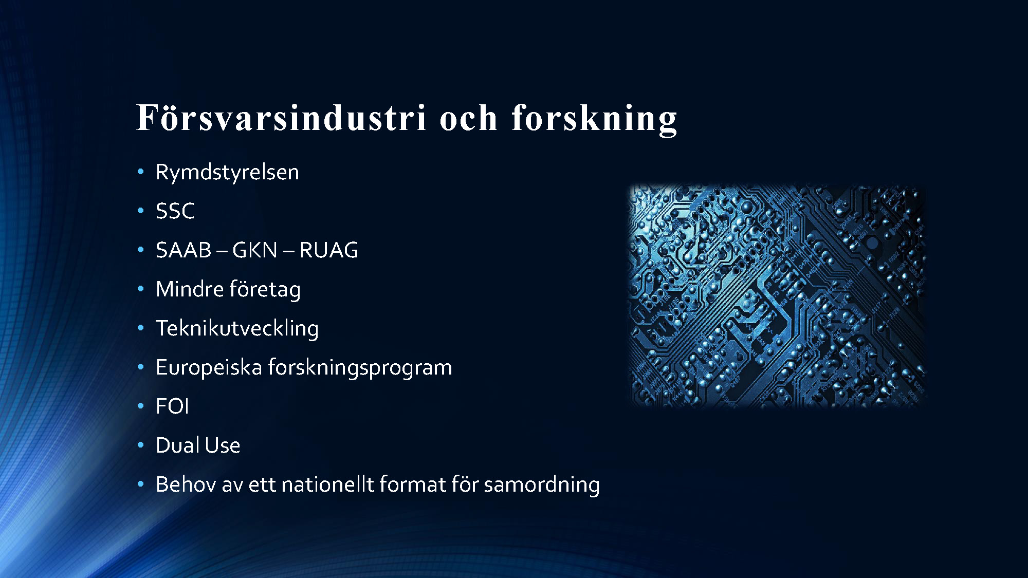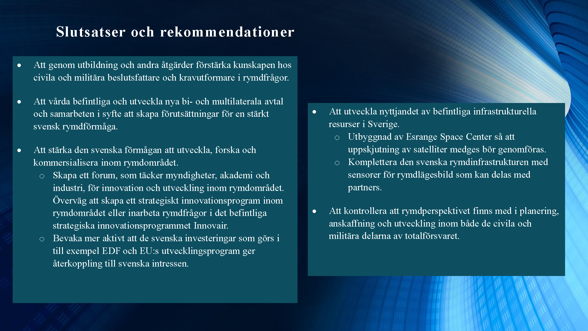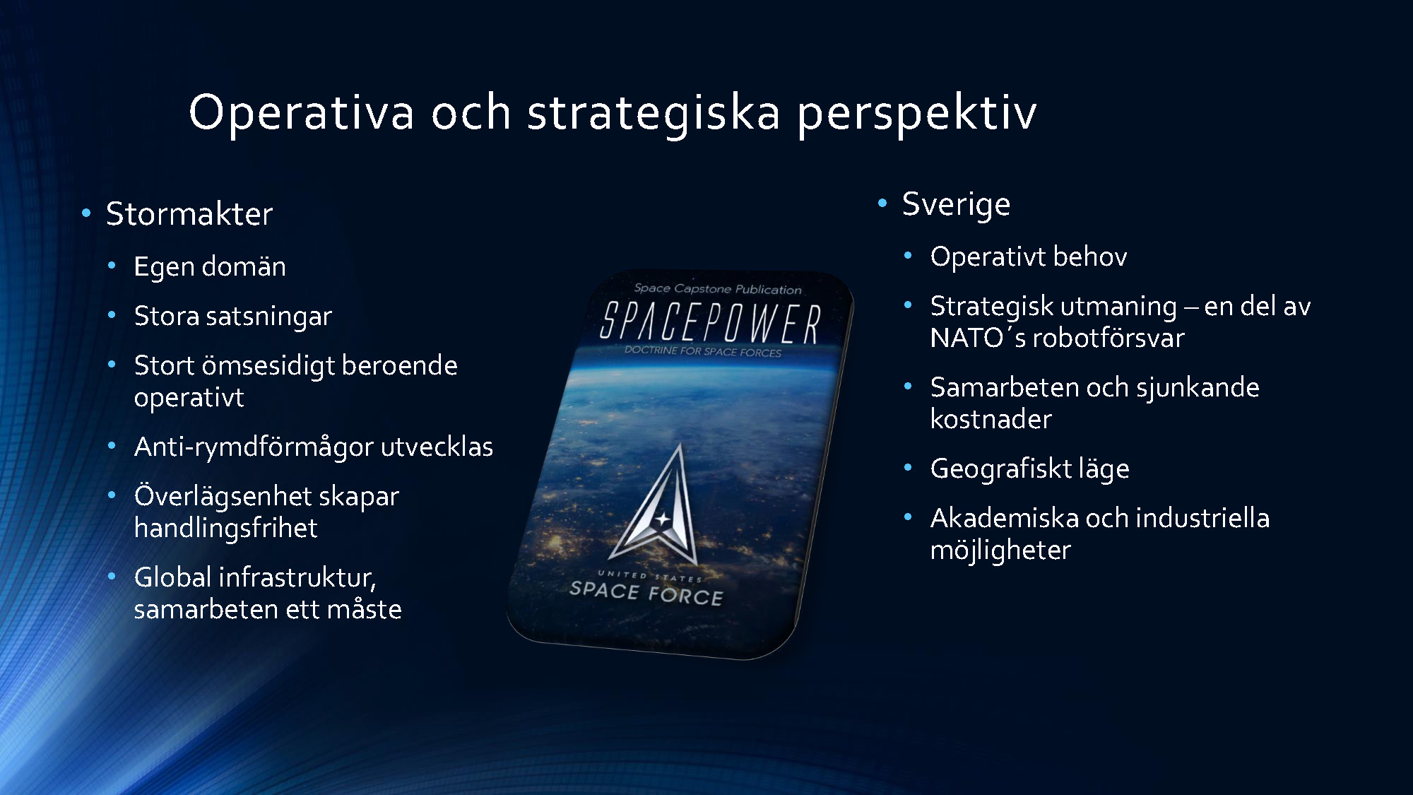 Andra programpunkten var en redovisning av ett arbete om rymden genomfört av en arbetsgrupp inom projektet Säkerhet i morgondagens Europa – Svenska perspektiv. Ledamoten Mats Helgesson som lett arbetet redovisade tillsammans med professor Christer Fuglesang (ledamot i franska flyg- och rymdakademien) som ingått i arbetsgruppen. I sina avslutande slutsatser förordade ledamoten Helgesson att Sverige ska utöka sitt arbete inom rymdområdet och att detta arbete berör alla avdelningar och därför med fördel skulle kunna bedrivas i en fast akademieövergripande arbetsgrupp. Arbete kommer att redovisas i Handlingar och Tidskrift. Bildspelet nedan sammanfattar ledamoten Helgessons anförande. Du kan också se bildspelet som pdf-fil här »